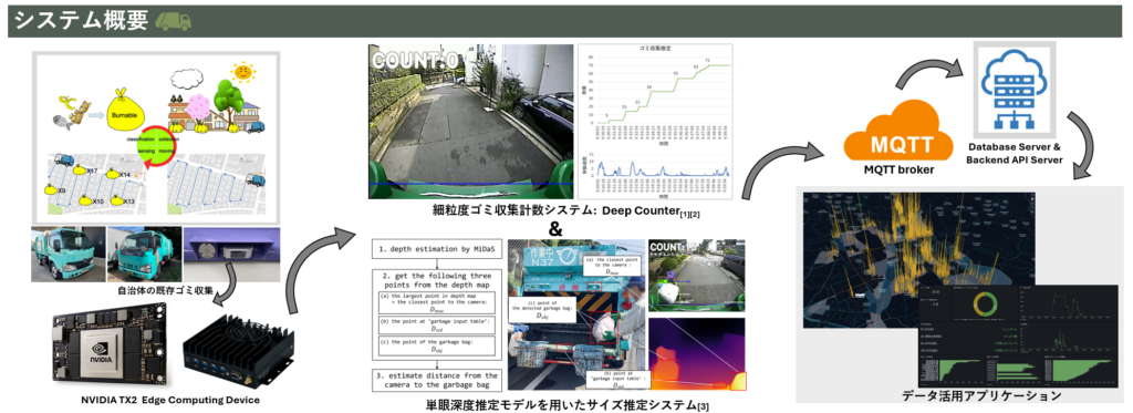 概要:近年、自治体のごみ処理を取り巻く環境は厳しさを増しており、最終処分場の確保の困難化やごみ収集事業者の人材不足などが課題となっている。 例えば、神奈川県鎌倉市では2025年3月焼却炉の稼働停止となった。また、自治体には効率的な行政運営や市民サービス向上が求められる一方で、施策の効果を説明する責任も高まっている。 鎌倉市では市民サービスの観点から2025年4月より一部地域で戸別収集を開始した。戸別収集は近年、他の自治体でも実施されている事例はあるが、戸別収集がごみ排出量や収集業務に与える影響を定量的に評価した研究は少ない。 さらに、自治体が保有するデータは収集車単位の回収重量が中心であり、地域や地点ごとの細粒度な排出量データは不足している。 本研究では、複数の深層学習モデル、エッジAIデバイス、モバイル通信網を組み合わせた広域センシングにより、細粒度のごみ排出量データ基盤を構築し、データ基盤で収集したデータを活用し、鎌倉市における戸別収集施策の影響について定量的・定性的な分析を行うことを目的とする。