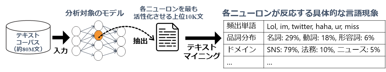 ニューラルネットワークベースの自然言語処理モデルは,目的タスクに最適化された内部ベクトル表現またはニューロンを学習する能力によって,様々な自然言語タスクで成功を収めています.しかし,モデルが実際にどのような言語現象を学習するのかを理解することは困難で,多様なモデルの構成要素や広範な言語現象を対象とした調査を行うことは難しくなっています.本研究では,モデルの最も細かな構成要素である “ ニューロン” に注目し,そのニューロンが捉える多様な言語現象を明らかにする統一的な方法論を提案しています.提案手法は,言語注釈(例 : 品詞タグ)とメタデータ(例 : 著者)で拡張された大規模テキストコーパスを用いて,ターゲットモデルの各ニューロンを活性化する文集合を抽出し,頻出パターンマイニングやクラスタリングによる抽象化によって,各ニューロンが捉える言語現象を明らかにします.加えて,各ニューロンに紐づく文集合や言語現象に基づいて,複数ニューロン間の関係についても深い洞察を与えます.