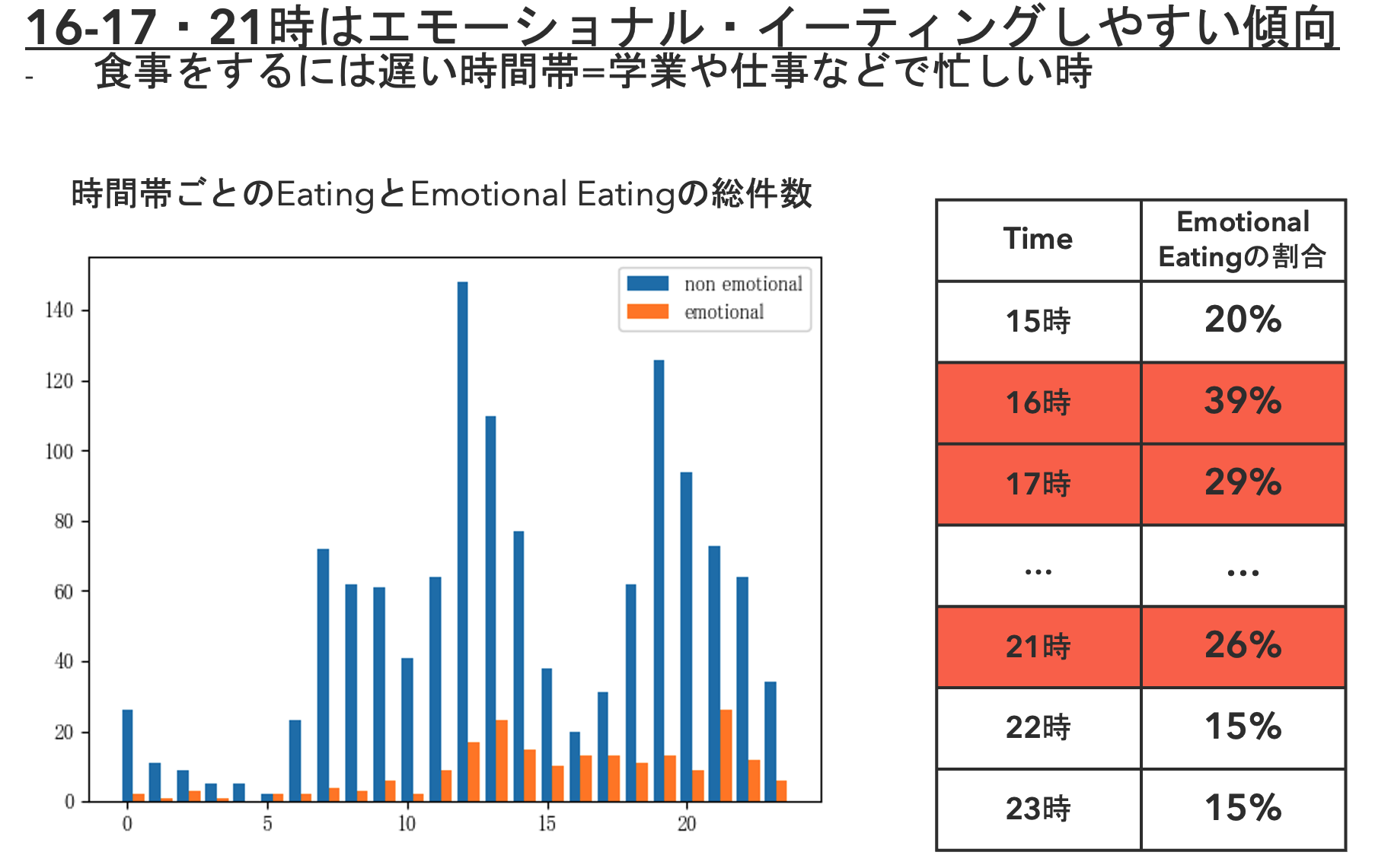 本研究では,ユーザが日常的に利用しており,かつ利用者の行動パターンの特徴が表れるスマートフォンのセンサ情報と機械学習を組み合わせることで,エモーショナルイーティングの検知に取り組見ました.そして,スマートフォンのセンサデータと食生活データを収集する SEED システムを構築し,収集データからエモーショナル・イーティングを検知する機械学習モデルを作成しました.本システムを用いて 60 人の被験者から 28 日間のデータを収集したところ,87.5%の精度でエモーショナル・イーティングを検知することに成功しました.