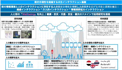 Therefore, this research aims to create a technological foundation , design theories and guidelines to realize interactions that beyond human bounded rationality in a smart city and to achieve social wellbeing (Fig. 1). The specific goal is to improve people’s health, safety, convenience, and enjoyment in a smart city, which is also an information space that comprehensively contains dynamic information throughout the city. To beyond the three limitations of bounded rationality[2] such as the limitation of rationality, the limitation of outreach and the limitation of vision) in a smart city, we are going to build an interaction infrastructure that supports the process of deciding the optimal action from information (Research Subject 1: Interaction of Awareness), the process of distributing information to the city (Research Subject 2: Human City Interaction with non-human like robots ), and the process of acquiring correct information from the city (Research Subject 3: Interaction of Expanding Perspective). This research will enable people with expanded intellectual rationality to acquire information on health, safety and disaster prevention, and amplifying enjoyment from the huge information space and behave optimally, which will result in extending healthy life expectancy, reducing traffic accidents, coping with large-scale disasters. Moreover, it can greatly promote the wellbeing of society.